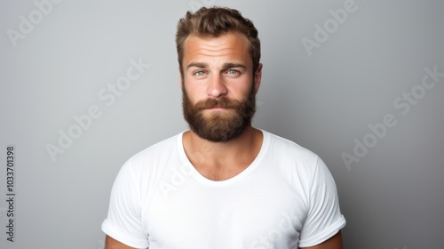A bearded man in a plain white T-shirt poses against a neutral background, embodying simplicity and modern casual style.
