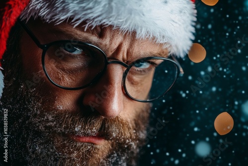 A bearded man in glasses and Santa hat stands in falling snow, with a serious expression, evoking thoughts of determination amidst the serene holiday snowfall.