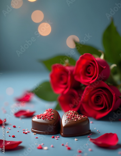 A beautiful arrangement of red roses and heart-shaped chocolates on a table.