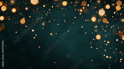 A beautiful background featuring shimmering golden bokeh lights against dark teal backdrop, creating magical and festive atmosphere perfect for celebrations