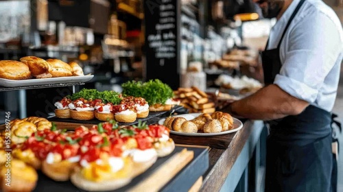 A beautiful catering display showcasing appetizers and delicacies arranged meticulously, creating an inviting atmosphere for gatherings and celebrations.
