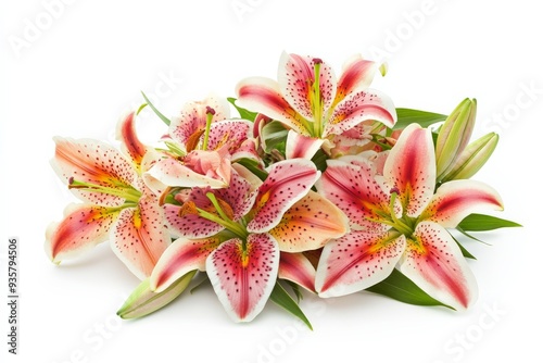 A beautiful cluster of pink lilies with white edges, green leaves, and vibrant colors perfect for floral and nature-themed projects, isolated on a white background.