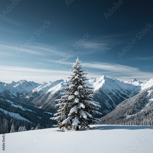 A beautiful evergreen Christmas tree stands alone covered in fresh snow high atop a majestic icy mountain peak during the peaceful winter season ,snow ,holiday ,scenic