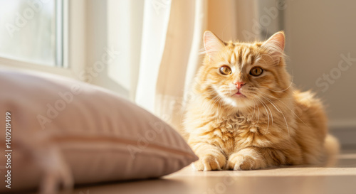 A beautiful ginger cat sitting on a wooden floor near a window, enjoying the sunlight.