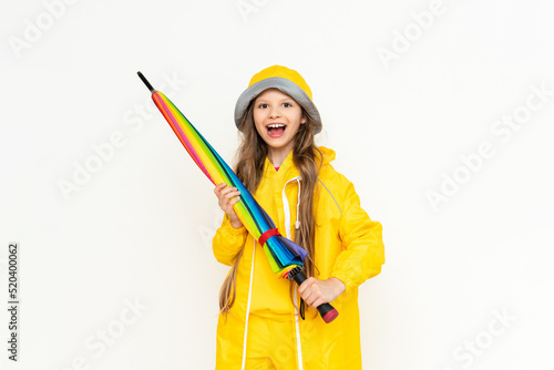 A beautiful girl holds a multicolored closed umbrella on a white isolated background. A child dressed in a yellow raincoat and a panama hat from the rain.