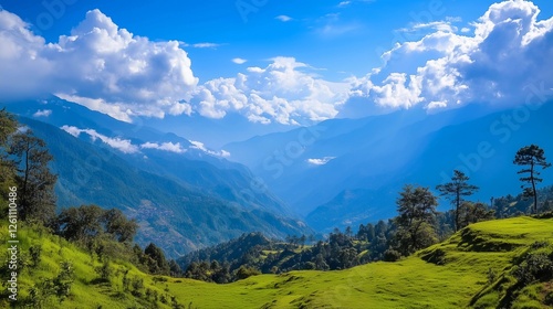 A beautiful mountain range with a clear blue sky. The mountains are covered in trees and the grass is lush and green. The scene is peaceful and serene