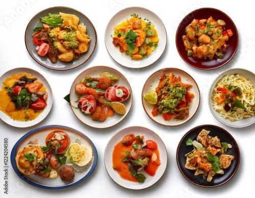 A beautiful top view of a set of plates of food, each meticulously arranged and isolated on a clean white background. This food collection showcases a variety of delicious dishes