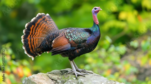 A beautiful turkey displaying its fan of iridescent feathers in a rural setting.