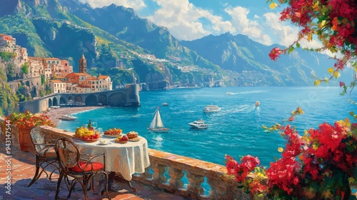 A beautiful view of the Amalfi Coast, with boats and houses on mountains overlooking an azure sea.