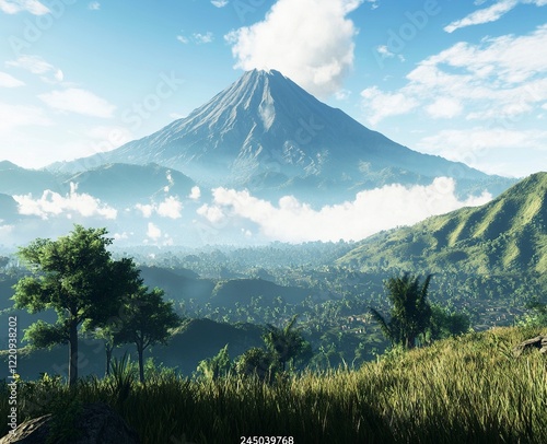 A beautiful view of the mountain in Oatroom, on which you can see an Indonesian volcano covered with clouds and trees in front of it.