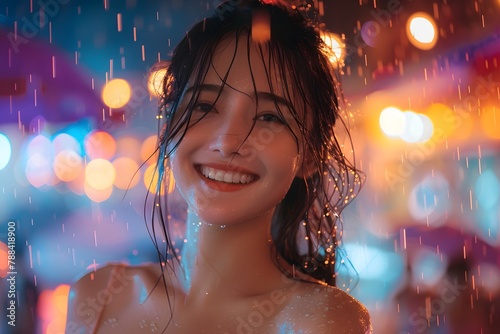 A beautiful woman who is extremely happy, It was as if in her mind she saw herself happily dancing outdoors with her friends in the rain the lights lit up with beautiful colors refreshing atmosphere.