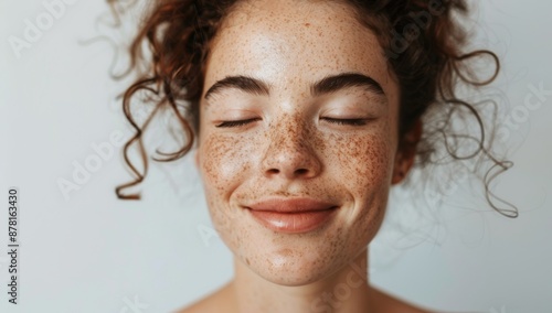 A beautiful woman with brown hair and freckles Beautiful young woman with flawless skin. Portrait of a beautiful model wearing natural nude makeup. Spa, skincare, and wellbeing. White background