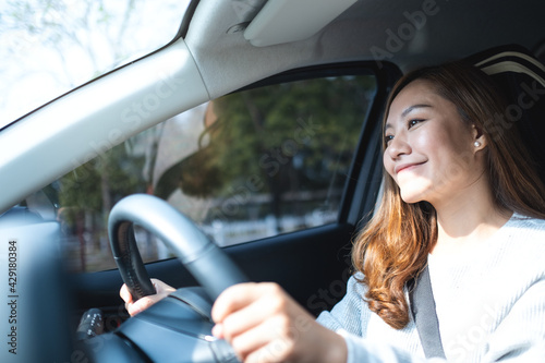 A beautiful young asian woman holding steering wheel while driving a car