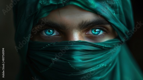 A beautiful young man wearing an emerald green hijab covering his face, his eyes shining blue and turquoise with long eyelashes.