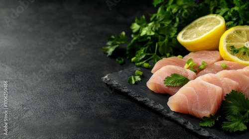 A beautifully arranged seafood platter showcases thin slices of sashimi, garnished with vibrant herbs and zesty lemon slices, set on a stylish slate board with space for text