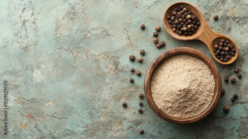 A beautifully arranged wooden bowl of brown sugar alongside peppercorns on a textured surface, highlighting the essential ingredients for flavoring in cooking and baking.