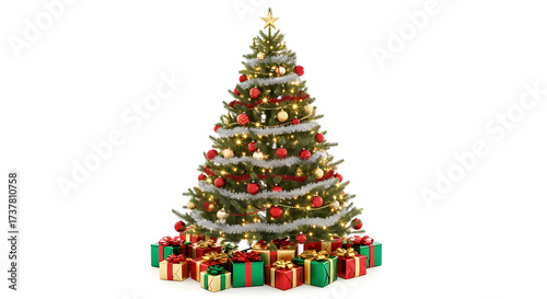 A beautifully decorated Christmas tree, adorned with ornaments and lights, surrounded by wrapped gifts. It's the perfect image to evoke the festive spirit of the holidays.