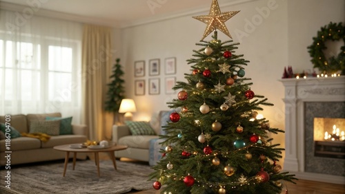 A beautifully decorated Christmas tree stands tall in a cozy living room, winter wonderland, fireplace decor, presents, winter holidays