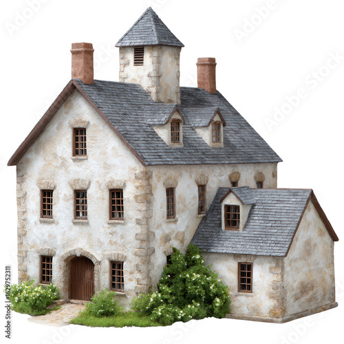 A beautifully detailed model of a vintage house, showcasing intricate stonework and charming architectural features, set against a clean white background.