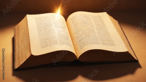 A beautifully illuminated book opens wide, revealing pages with wisdom under a radiant sunrise