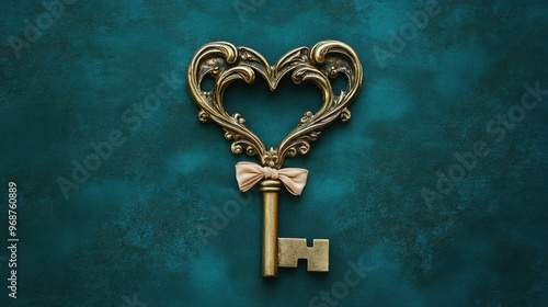 A beautifully ornate golden key with a heart-shaped bow, lying on a deep teal background, creating a contrast of warmth and elegance