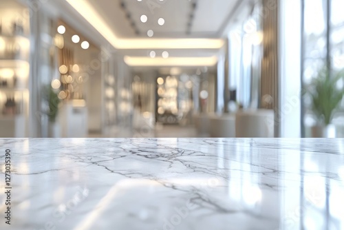 A beautifully polished marble countertop with a blurred modern interior in the background, highlighting elegant design features.
