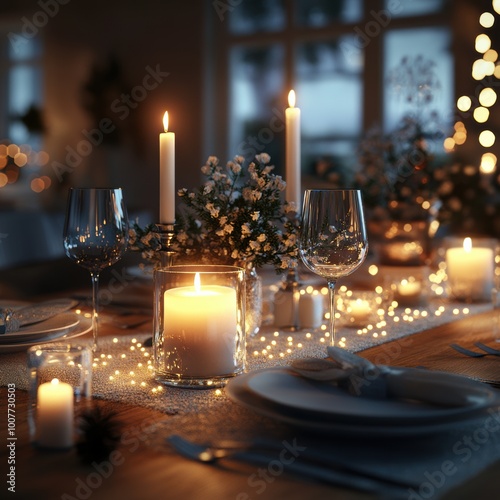 A beautifully set dining table with candles, flowers, and warm ambiance, perfect for a cozy gathering or special celebration.
