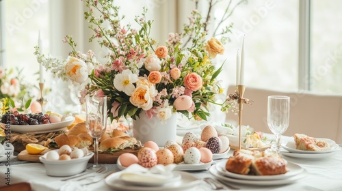 A beautifully set Easter brunch table, featuring decorated eggs, fresh spring flowers, and delicious food, capturing the warmth of a family gathering
