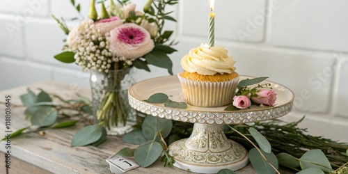 A beautifully styled cupcake with a lit candle, sitting atop a elegant tiered serving dish or pedestal surrounded by fresh flowers and greenery, tiered, pedestal