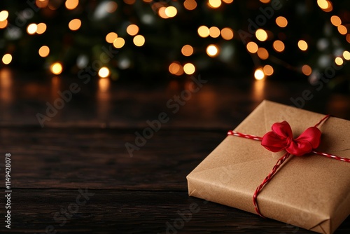 A beautifully wrapped gift sits on a wooden surface, adorned with a red ribbon, against a backdrop of sparkling festive lights.