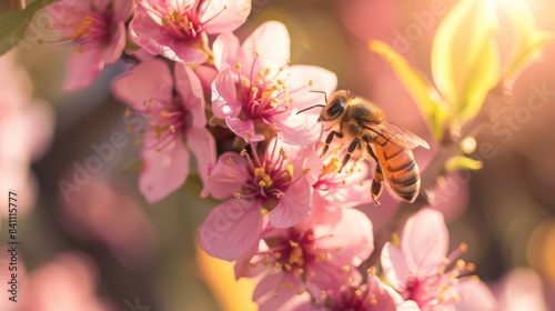 A bee gathering nectar from a peach flower