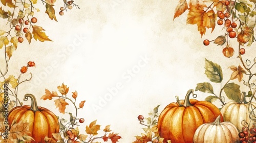 A beige background is adorned with a watercolor autumn border featuring pumpkins and leaves