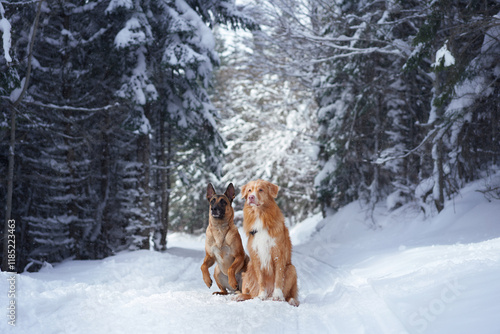 A Belgian Malinois and a retriever standing together in a snowy forest. The two dogs are surrounded by snow-covered trees, creating a peaceful winter scene.