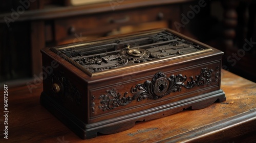 A bespoke, antique music box, carved from dark, unknown wood, its melody sealed, intricate mechanism exposed, awaiting customs clearance.