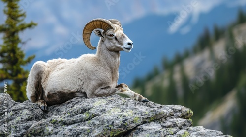 A bighorn sheep perched on a rocky mountain ledge