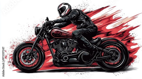 A biker in a black leather jacket and helmet rides a red and black motorcycle with a red and black background.