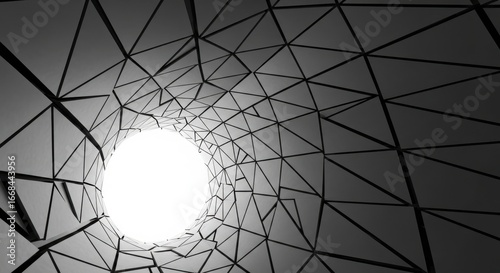 A black and white abstract geometric pattern creates a tunnel effect leading to a bright white circular light source