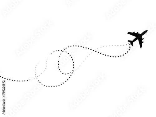 A black and white airplane is flying in a curved line