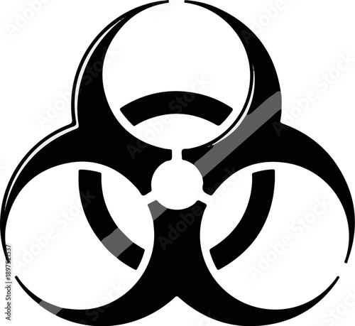 A black and white biohazard symbol, starkly rendered with sharp lines and segmented curves