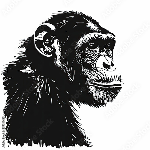 A black and white drawing of a chimpanzee on a white background