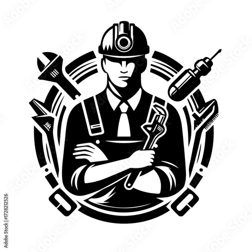 A black and white illustration of a construction worker, holding a wrench, surrounded by tools.