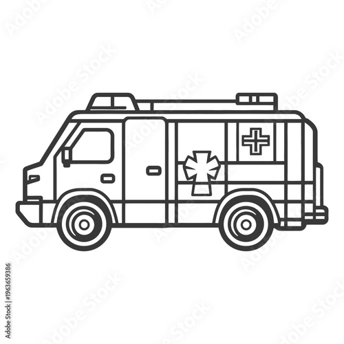 A black and white illustration of an ambulance vehicle