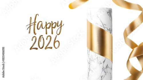 A black background with happy 2026 in gold text, a marble pillar and gold ribbon on the right side