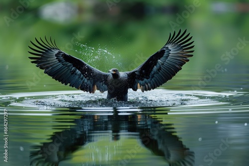 A black bird is in the water, splashing water with its wings
