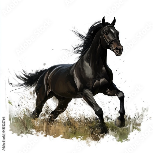 A black horse galloping, full-body shot, against a white background, in high-definition photography.