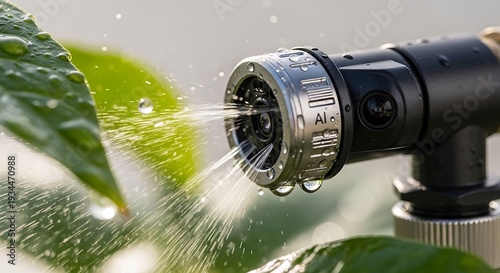 A black hose nozzle spraying water on green leaves on a sunny day outdoors