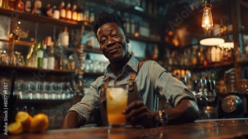 A Black man, bartender , look at camera,mixing drinks in a trendy bar.