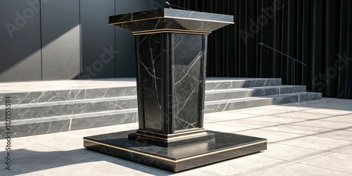 A Black Marble Podium with Gold Trim, Standing on a Set of Marble Stairs, Against a Black Curtain Background
