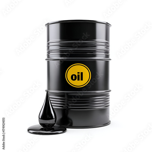 A black oil barrel with a spill, symbolizing fuel and energy resources in the industrial sector.