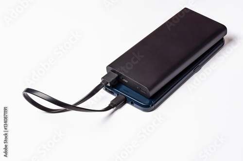 A black power bank charges a blue smartphone via USB, providing a convenient portable power solution.